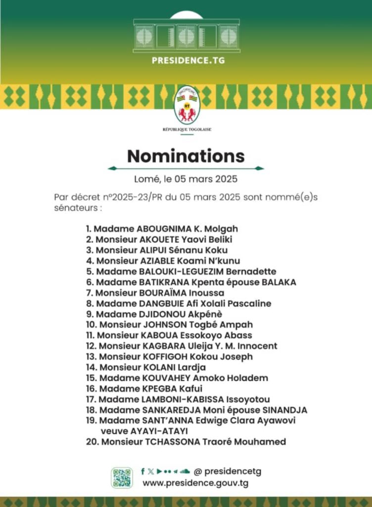 Le président togolais Faure Gnassingbé a procédé, ce mercredi 5 mars, à la nomination de 20 sénateurs, finalisant ainsi la composition des 61 membres du Sénat. La liste comprend des personnalités issues du parti au pouvoir UNIR ainsi que certains leaders de partis de l’opposition.